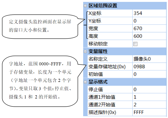 攝像頭控件是在顯示屏指定區(qū)域顯示攝像頭監(jiān)控畫(huà)面。變量只有3個(gè)取值:停止值、攝像頭通道1的開(kāi)始值、攝像頭通道2的開(kāi)始值。當(dāng)通過(guò)0x82指令向變量單元寫(xiě)入開(kāi)始值時(shí),指定區(qū)域?qū)⒉シ艛z像頭監(jiān)控畫(huà)面;當(dāng)寫(xiě)入停止值時(shí),視頻停止播放。