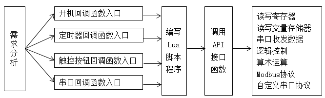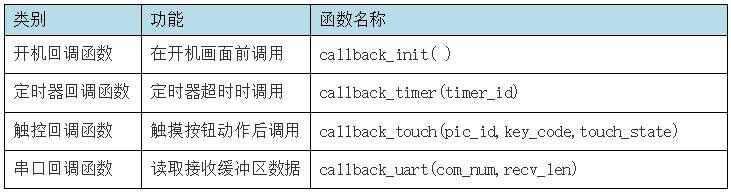 用戶根據(jù)應(yīng)用需要,在回調(diào)函數(shù)里編寫(xiě)Lua腳本程序,并下載到串口屏里。串口屏?xí)鶕?jù)回調(diào)函數(shù)類型,在不同的時(shí)間點(diǎn)執(zhí)行對(duì)應(yīng)回調(diào)函數(shù)里面的用戶Lua腳本程序。
